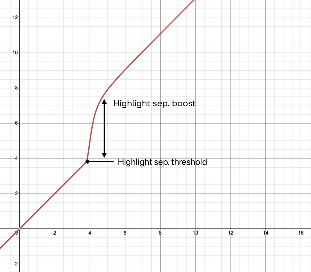 It involves boosting the signal from a certain threshold to increase the energy of the very high lights before applying the halo or diffusion, then applying the inverse of the boost to restore exposure of the original image, but with more pronounced diffusion on the highlights.