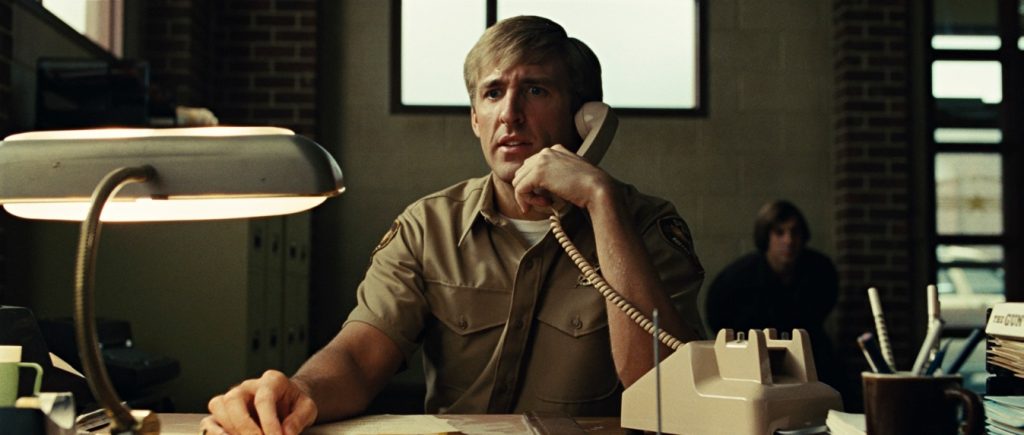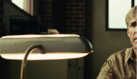 In the example above, from No Country for Old Men (shot on 35mm film), we can clearly see the halation modulations in the glass of the lamp that materializes the position of the bulbs. This same effect would be difficult to achieve in digital capture because the frosted glass of the lamp would probably be clipped, meaning that the recorded digital value would be identical across a large portion of the frosted glass. Without digital modulation, it would be impossible to reproduce this modulation in the digitally-generated halation.