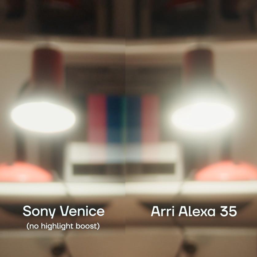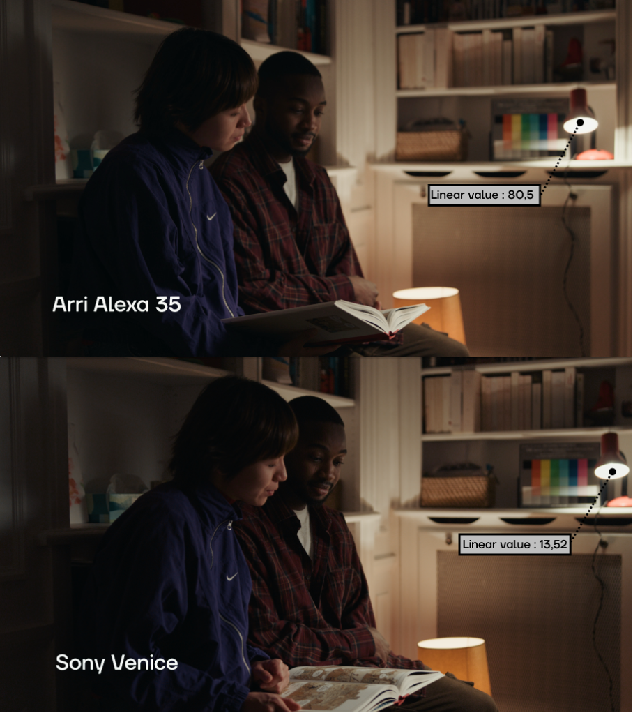 The diffusion is more pronounced on the lamp in the picture shot in Alexa, but a boost of the last EV recorded on the Venice can help to reinject the missing energy into the shot filmed in Venice.